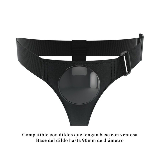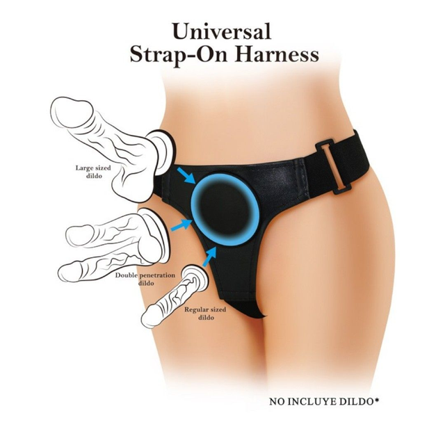 Este arnés universal lleva el juego a un nivel completamente nuevo. Es tan sencillo como adherir tu dildo favorito que tenga base con succión (ventosa) al arnés ya que no requiere de anillos ni broches.