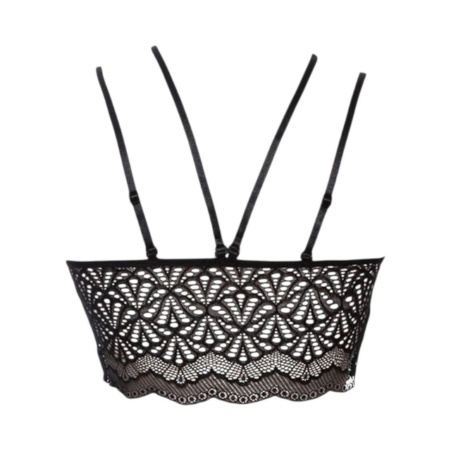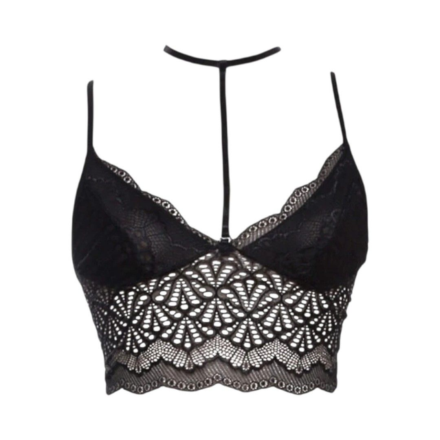 Explora toda tu sensualidad modelando este hermoso Bralette De Encaje Negro Con Tiras Necklace. Su color negro te entrega elegancia y la tela transparente se moldea a tu cuerpo. Verse bonita y cómoda es posible gracias a los tirantes ajustables del Bralette.