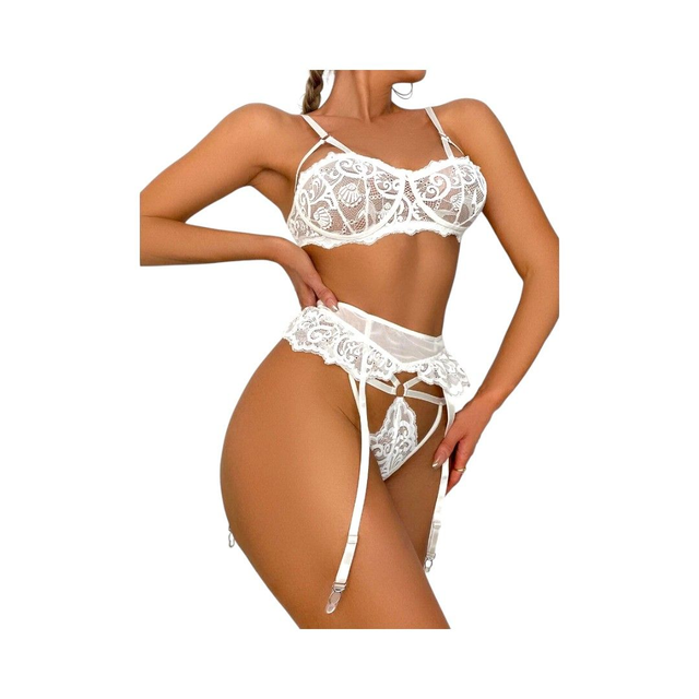Despierta tus sentidos con este set de lencería irresistiblemente sensual. Los delicados encajes, sus detalles de transparencia y las elegantes ligas te envolverán en una sensación de confort y lujo. Su diseño elástico se adapta a tu cuerpo a la perfección, realzando tus curvas con suavidad
