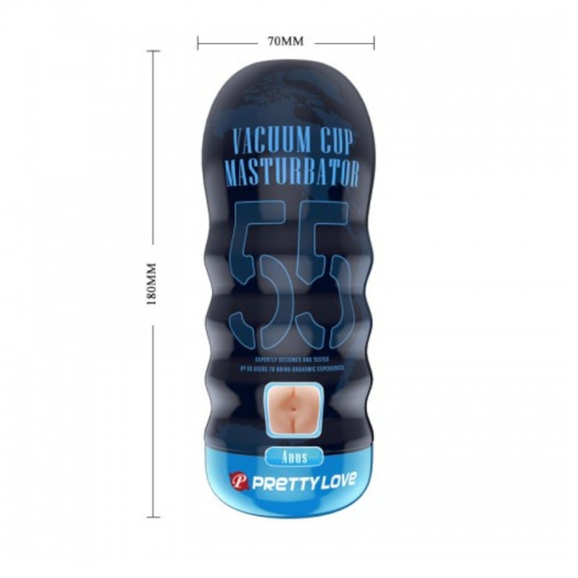 Vacuum Cup 55 Ano de Pretty Love es un novedoso masturbador para hombres que posee una textura muy realista de alta calidad que se siente muy natural al tacto. Simula la penetración anal gracias a su orificio de entrada y textura interior; además es super elasticado y se adapta fácilmente a cualquier tamaño.